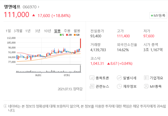 2021년 07월 13일 오늘 부) 전기차주 강세가 보이는 모습을 보이고 있습니다
