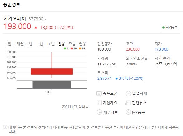 카카오페이는 시초가 18만원에서 7.2%오른 19만 3000원에 거래를 마쳤다.