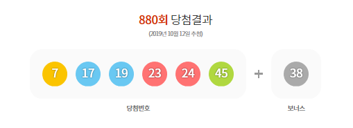 제880회 로또복권 추첨에서 1등 당첨번호는 ‘7·17·19·23·24·45’이었으며 2등 보너스 번호는 ‘38’이 당첨됐다.